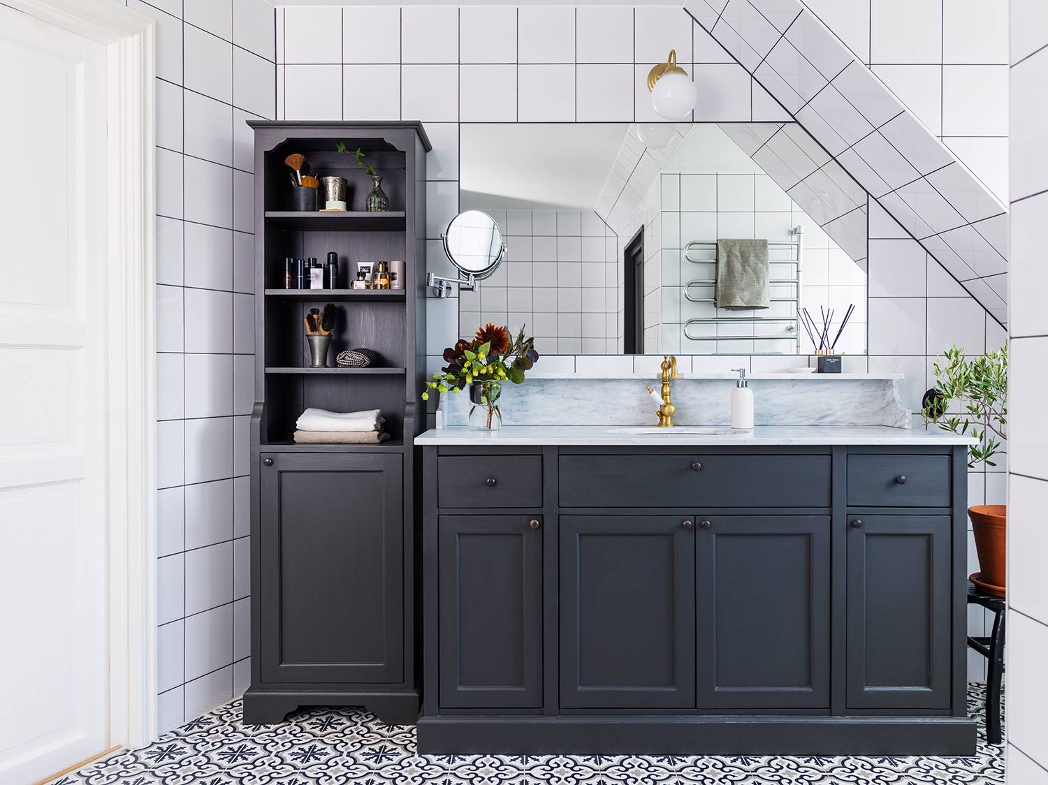 En solig höstdag öppnade Sofia Nordblad dörren in till den kringbyggda skånegården för oss på Qvesarum. Med genomtänkta lösningar och genuina material har familjen skapat ett badrum som känns både modernt och klassiskt samtidigt. Antracitgrå färg, mässing, klassisk badrumsinredning och de platsbyggda lösningarna sätter en tydlig ton i det nyrenoverade badrummet.