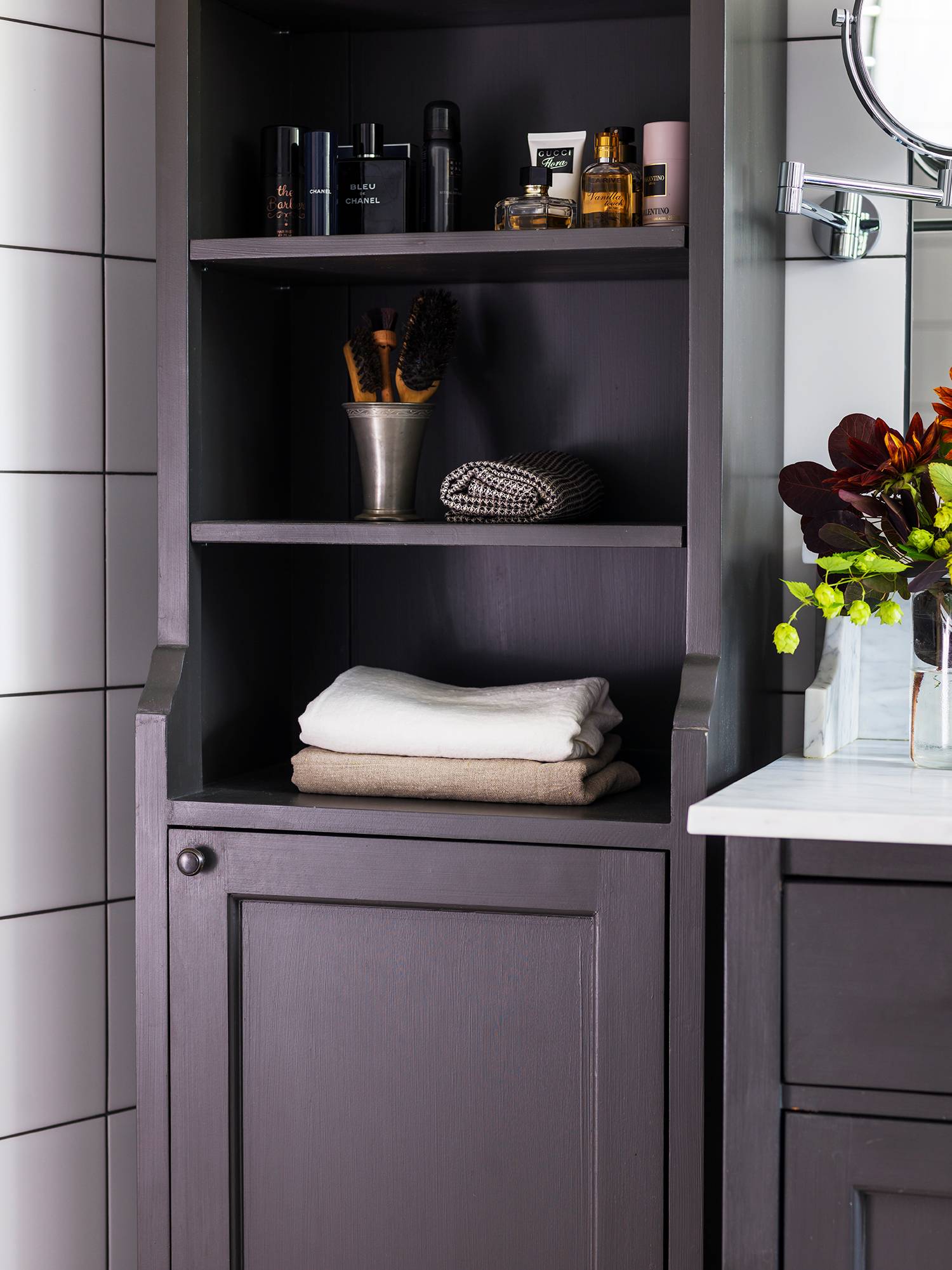 Badrummet hos familjen Nordblad känns både stor och luftigt. Från en fönsterkupa flödar dagsljuset in mot kommoden och badrumsspegeln där ljuset är av extra stor vikt. Badrumskommoden i modellen Agnes som familjen valt erbjuder både gott om förvaring i skåp och lådor och bra avställningsyta på ovansidan. Just denna kommod har en hylla ståendes på skivan, vilket adderar den klassiska känslan. Skivan är dessutom i carraramarmor, vilket är både naturligt och hållbart. Intill kommoden är högskåpet Alice placerat. Ett högskåp o badrummet ger extra möjlighet till förvaring av exempelvis handdukar, parfym och hudvård. Skåpets övre del har öppna hyllor och underdelen en skåplucka för dold förvaring.
