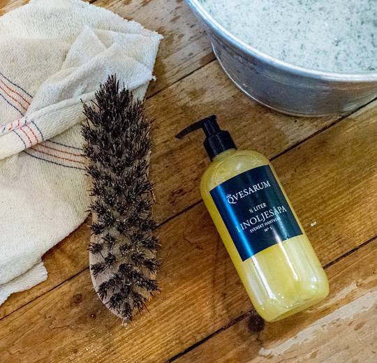 3. Fyll en tioliters hink full med kallt eller ljummet vatten och blanda i 2-3 dl Qvesarums Linoljesåpa i hinken. Vid skurning av ett extremt torrt trägolv rekommenderar vi dubbla mängden såpa för att du ska få ett bra resultat.