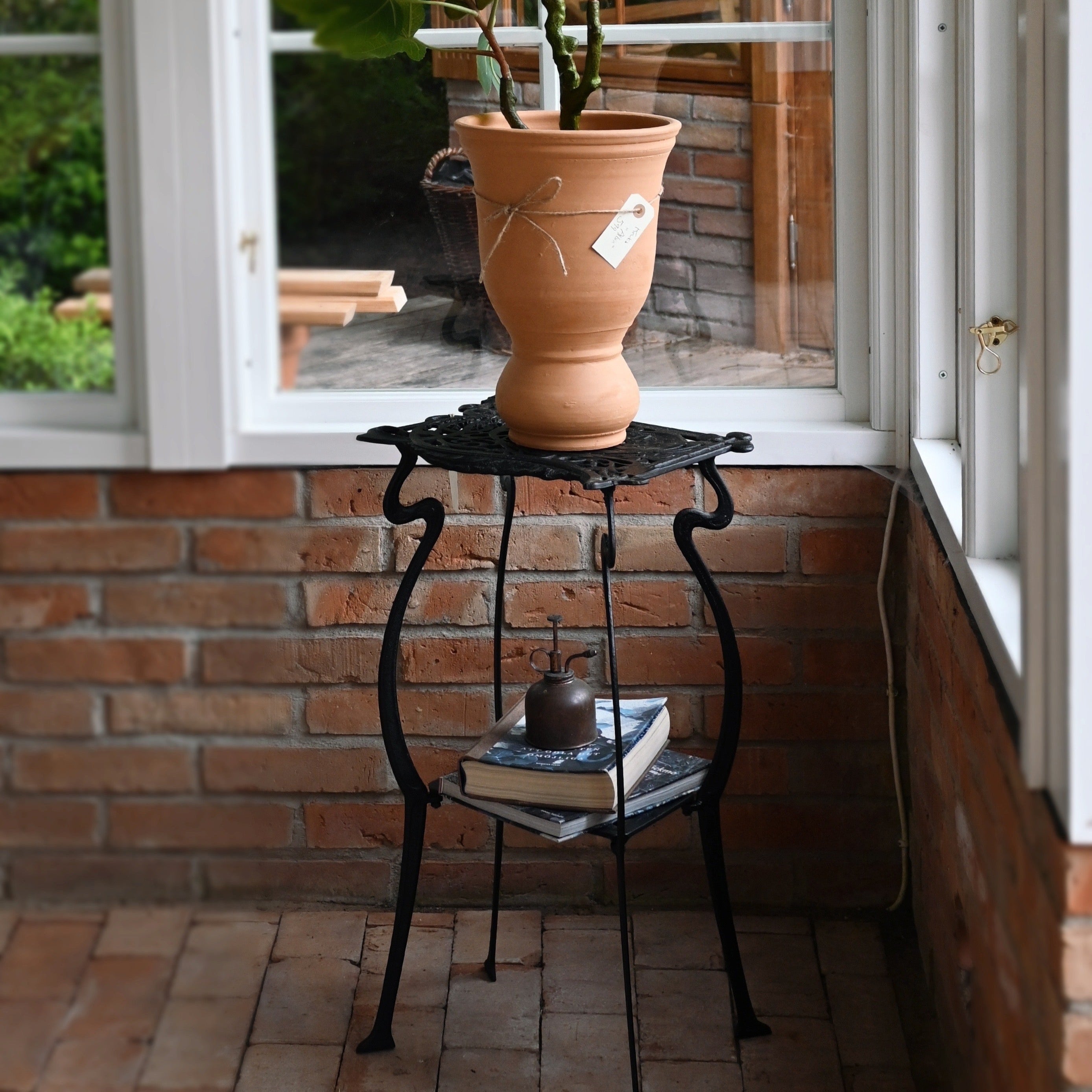 Kleiner Beistelltisch aus Gusseisen im Jugendstil mit zwei Ablageflächen und wunderschönem ornamentalem Blumenmuster. Nicht rostgeschützt und für den Innenbereich bestimmt.