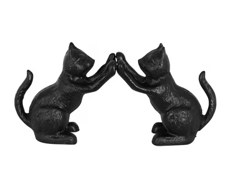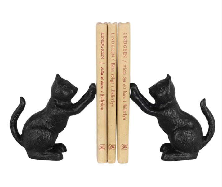 Lägg till en lekfull och elegant detalj i din bokhylla med dessa bokstöd i svart gjutjärn. Formgivna som två katter som sträcker sig mot varandra. De ger både funktion och karaktär till ditt hem. Perfekta för kattälskare och den som vill ge sin inredning en personlig touch!