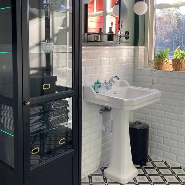 Burlington tvättställ Edwardian 560 mm med porslinspelare är ett klassiskt och vackert tvättställ. Avloppet döljs smickrande bakom porslinspelaren. Handfatet levereras med ett blandarhål på mitten av handfatet som standard.