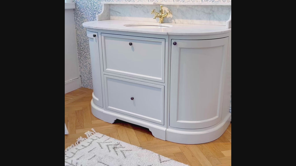 Denna badrumskommod i klassisk design har rundade hörn och svängda skåpluckor som ger möbeln ett mjukt och tidlöst uttryck. Toppskivan i carraramarmor kombineras med ett undermonterat handfat i vitt porslin för en elegant helhet. Stommen är tillverkad i massivt trä och MDF som penselmålas för hand i en vacker antikvit färg.