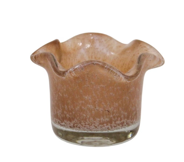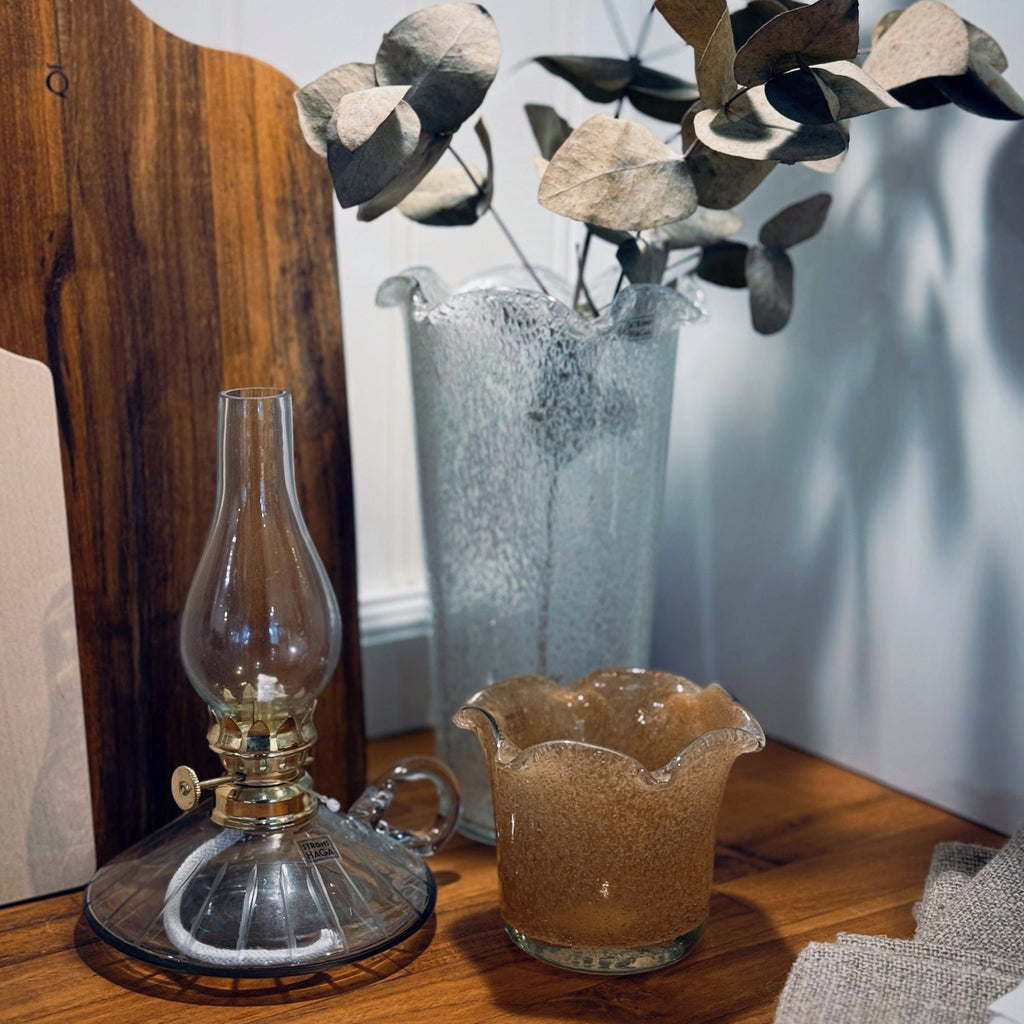 Denna ljuslykta i ljusbrunt glas med vågiga kanter ger ett mjukt och inbjudande sken. Perfekt för värmeljus, skapar den en mysig atmosfär i alla rum. Med sina naturliga skiftningar och tidlösa design passar den både i moderna och lantliga miljöer.