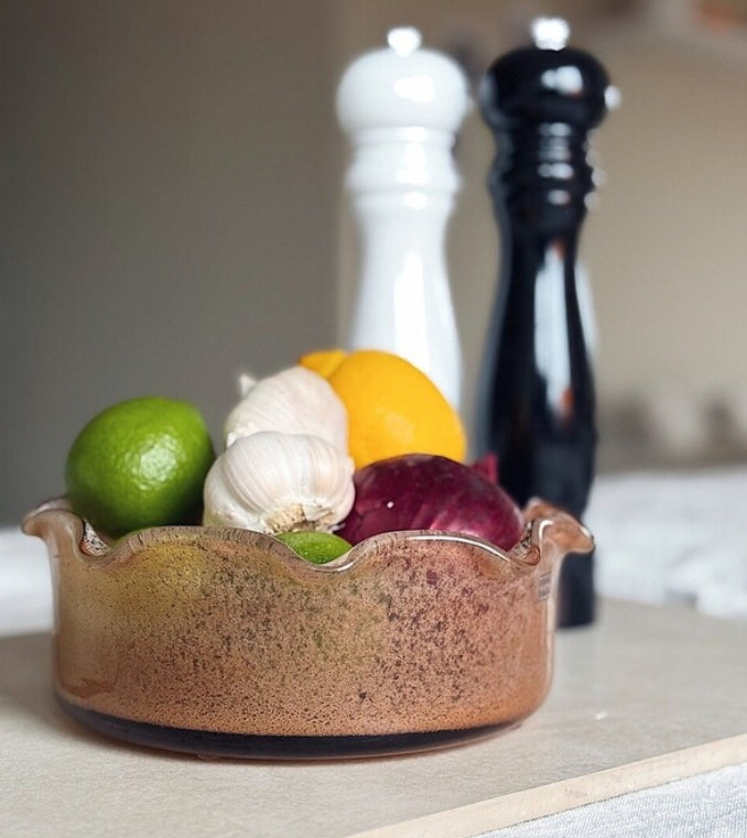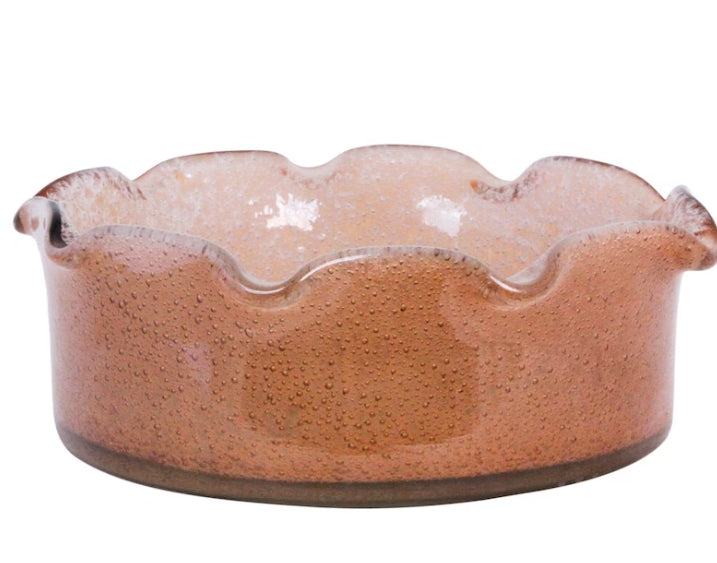 Denna skål i ljusbrunt glas med sin oregelbundna struktur och volangliknande kant ger en sofistikerad touch till din dukning. Perfekt för servering av sallader, frukter eller som dekorativ detalj. Med en diameter på 20 cm och höjd på 7,5 cm rymmer den lagom mycket för både vardag och fest.